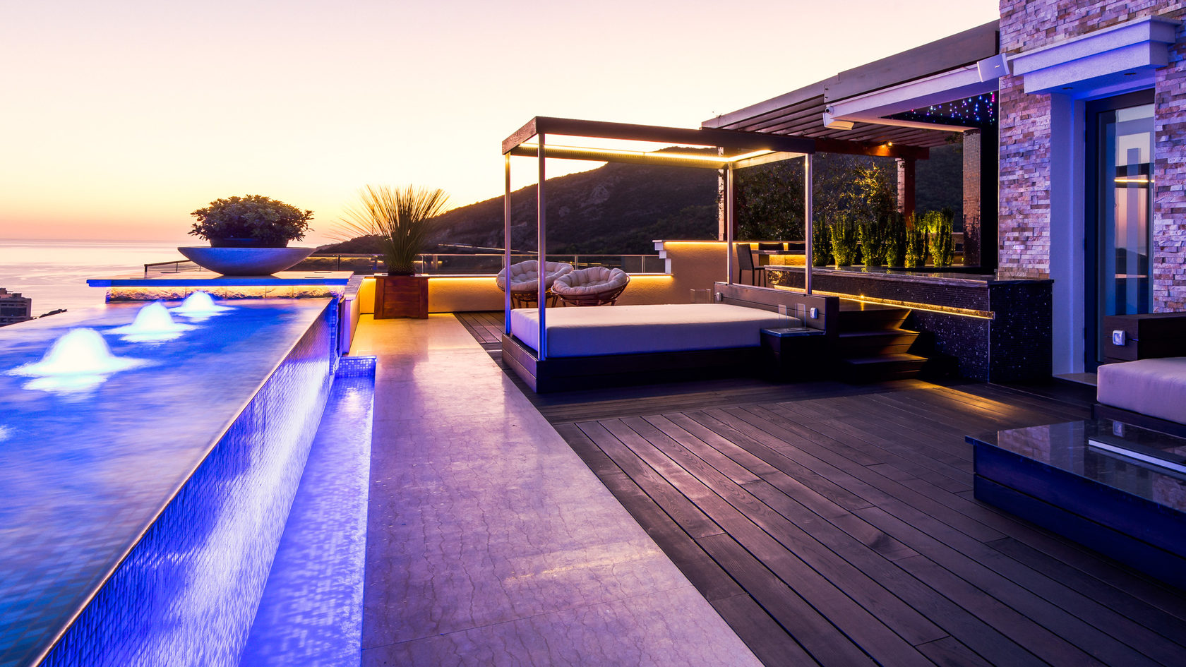 Апартамент занимает 2 последних этажа в жилом комплексе "MonteDreams". Лифт по индивидуальному коду поднимается прямо в апартамент. Из панорамных окон и террас открывается панорамный вид на Адриатическое море и остров Святого Стефана.